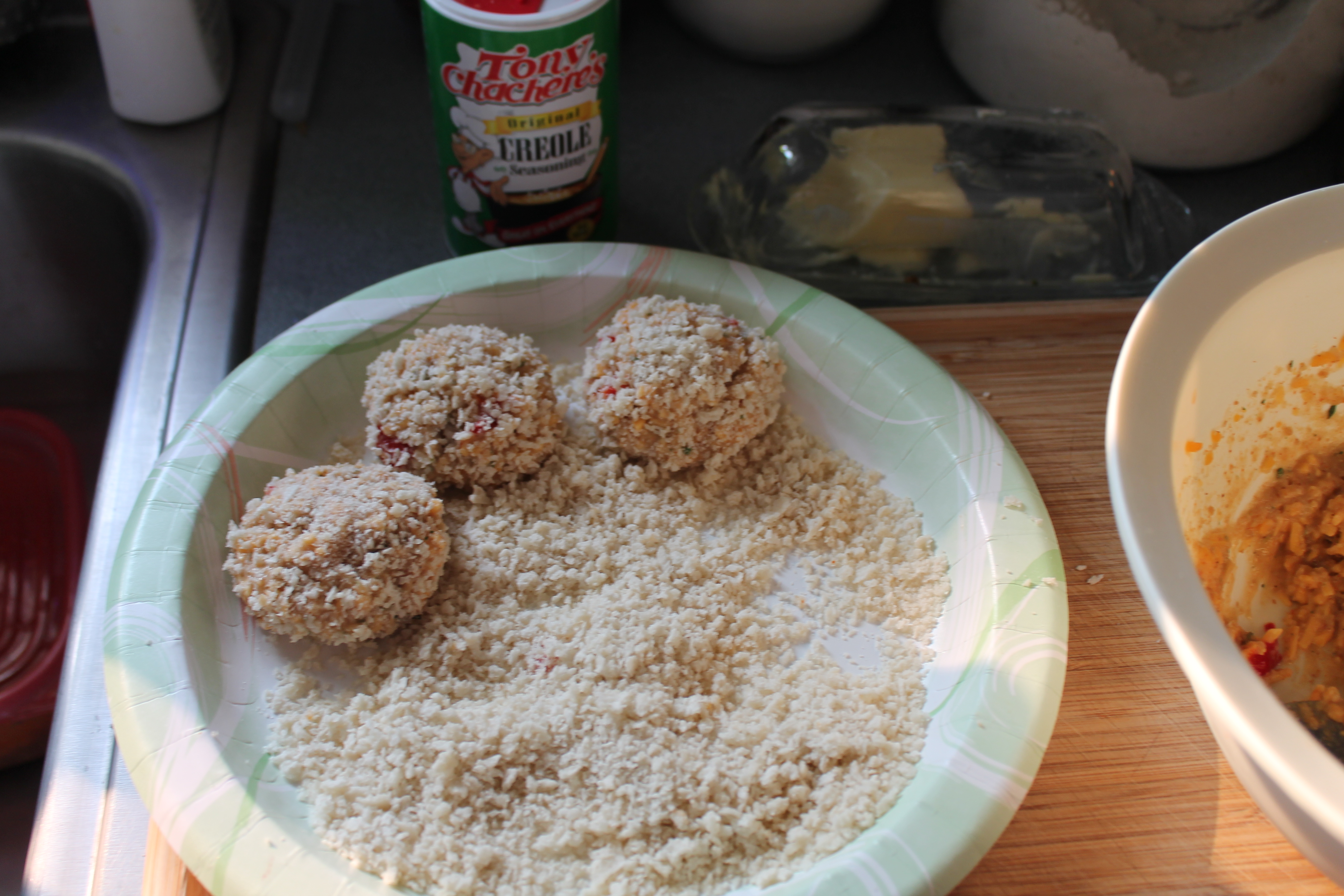 1. In a medium bowl combine cheese, pimentos, flour, hot pepper sauce, and Creole seasoning. Add egg whites and 1 cup of panko, combine together.