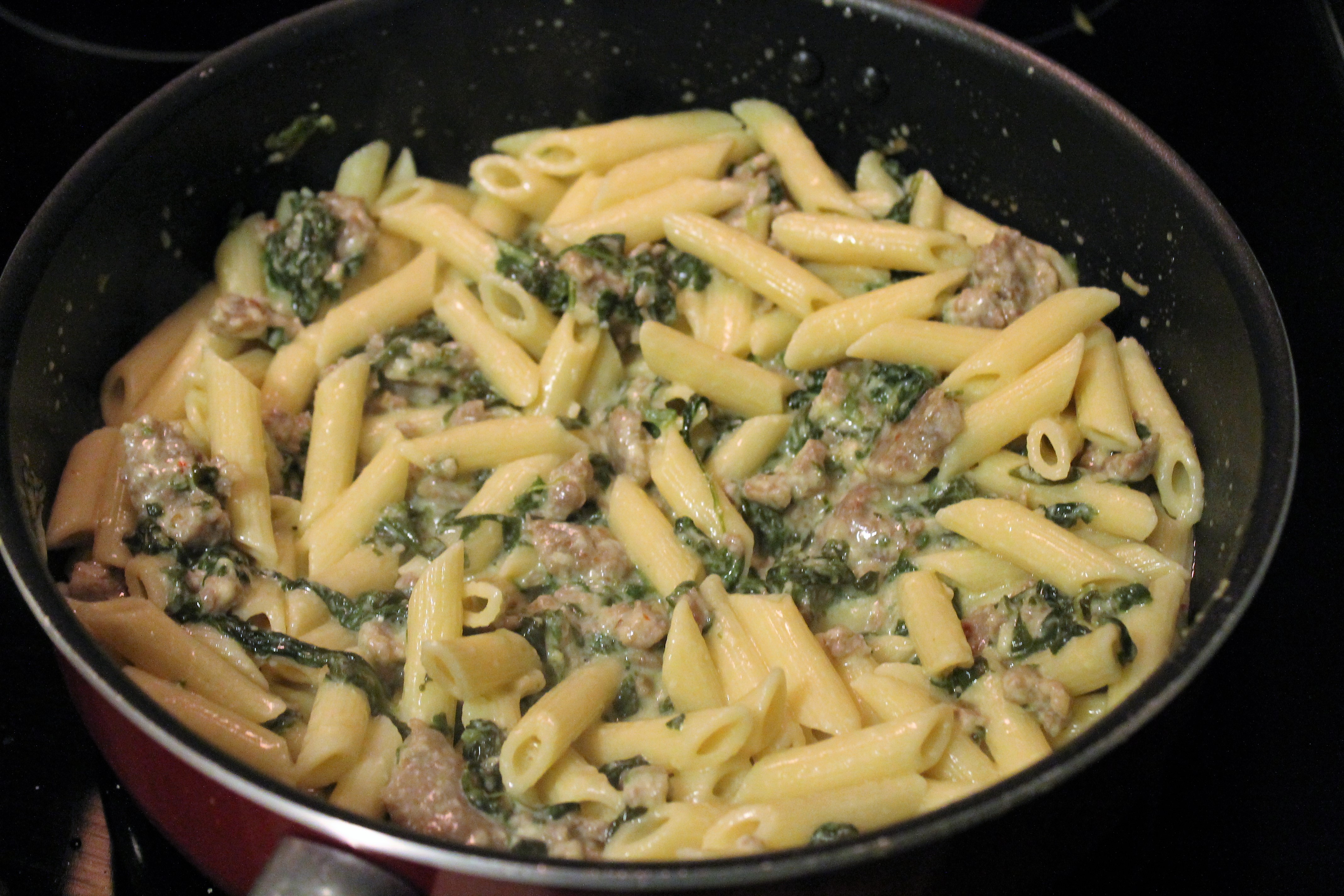 4. Add the milk to the spinach mixture and bring to a boil; cook 1 minutes. Sit in the sausage, parmesan, and a pinch of pepper. Reduce the heat to medium low and simmer, stirring occasionally, until slightly thickened, about 6 minutes.