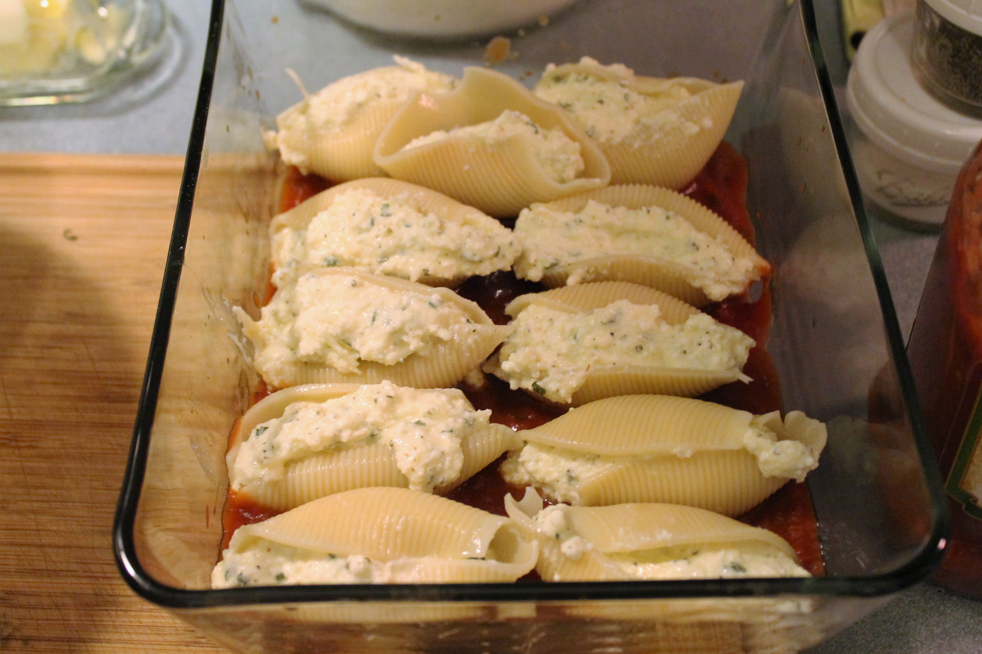 3. Now for the stuffing of shells. This is very easy but time consuming. Take each shell with a spoon of mixture and stuff your shells. Make sure your place the stuffed shells open side up and close together.