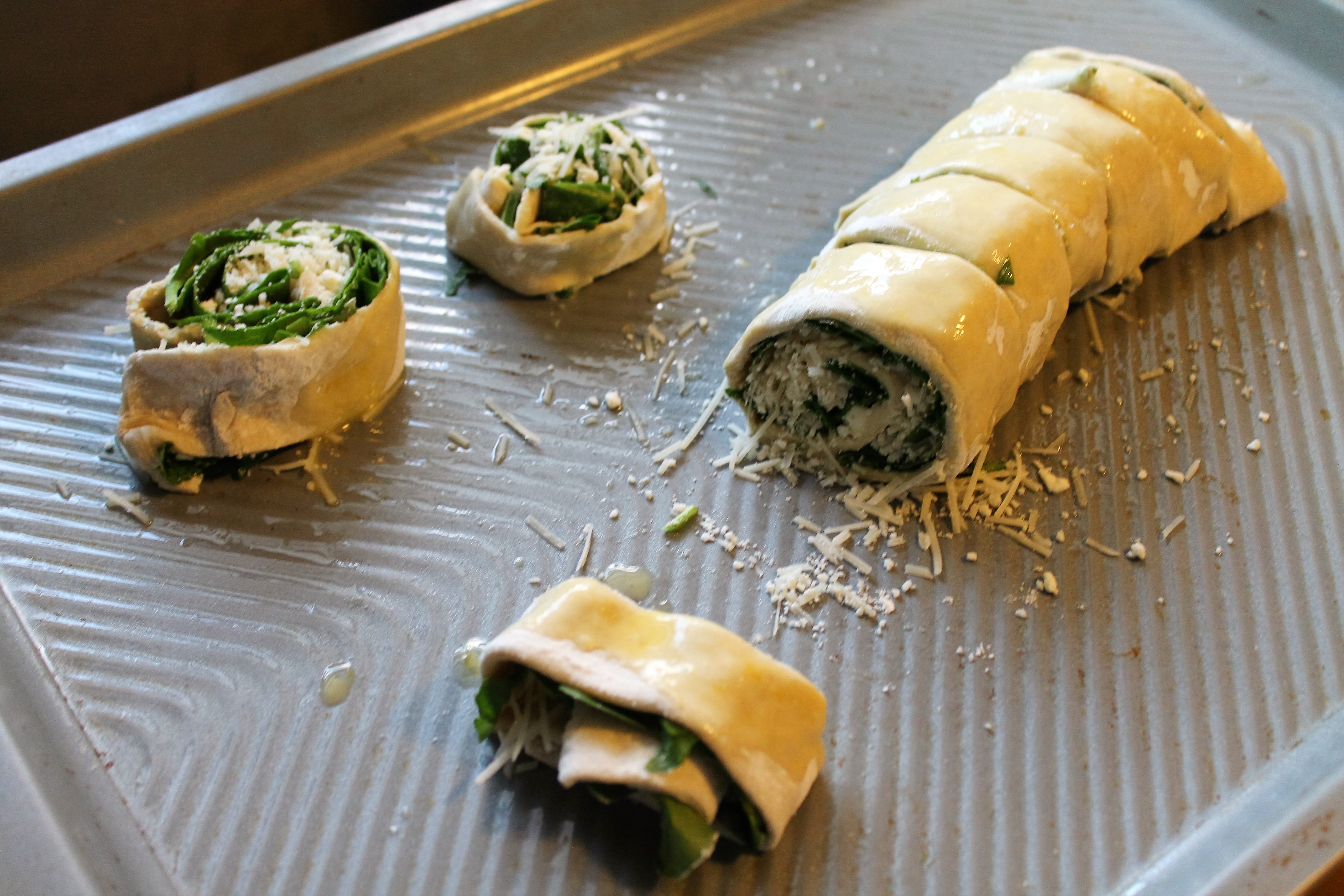 3. Unfold pastry sheet on a lightly floured surface. Brush with egg mixture. Top with cheese mixture and spinach. Starting at short side closet to you , roll up like a jelly roll.