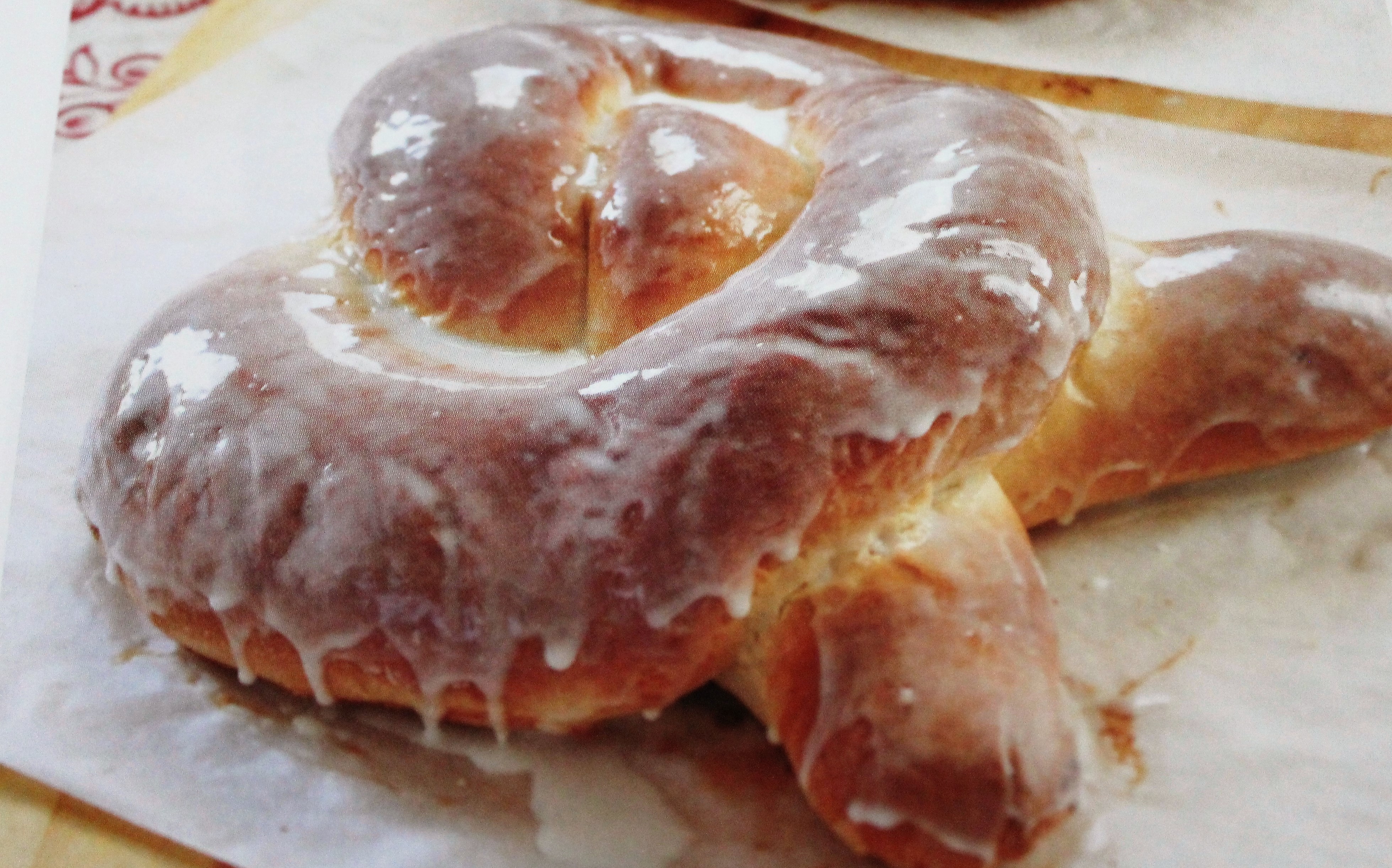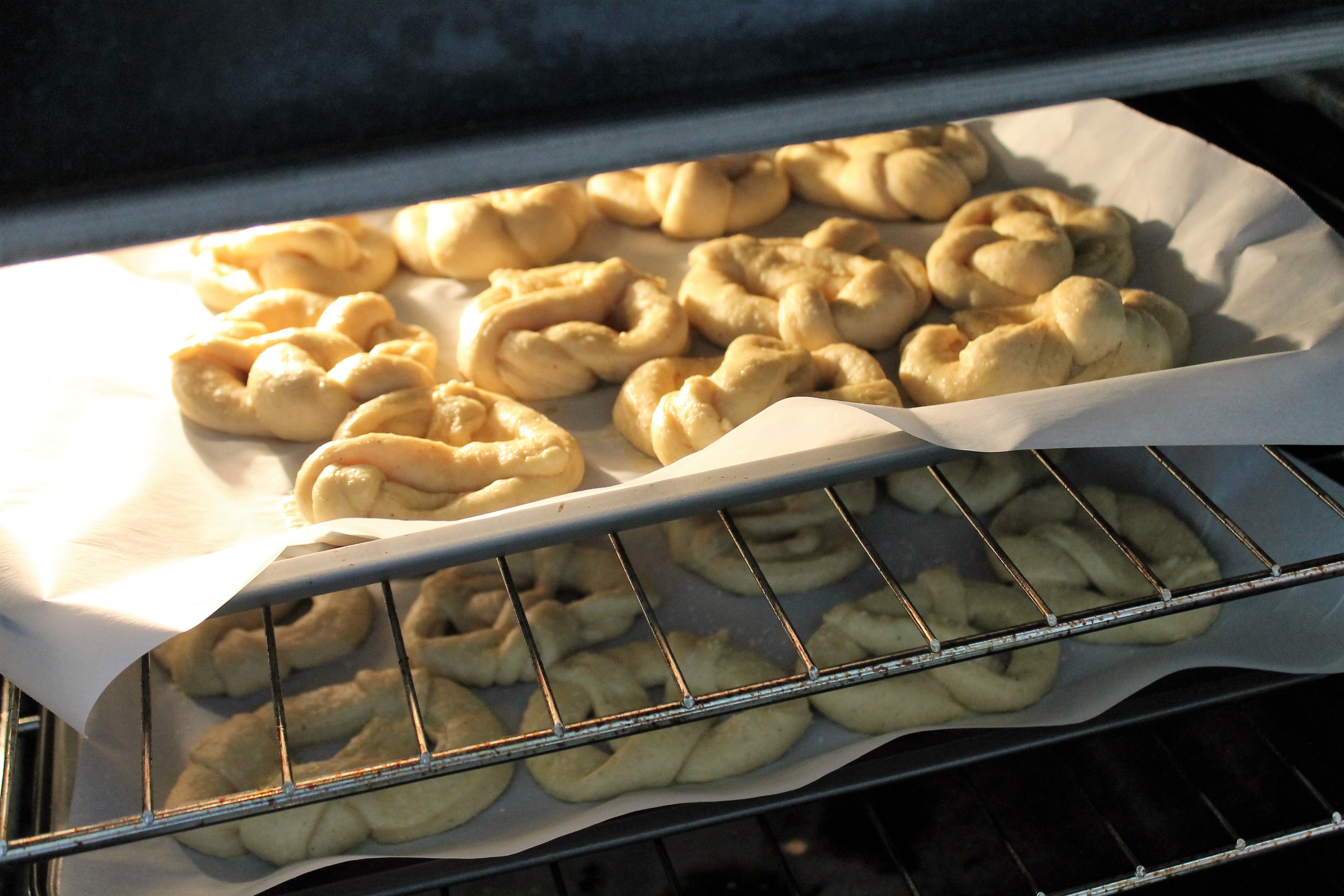 4. Line two rimmed baking sheets with parchment paper. Turn dough out onto lightly floured counter, divide into two equal pieces, and cover with greased plastic. Roll one piece of dough into 36-inch rope, about 1 1/4 inches thick, then transfer to prepared baking sheet and shape into large pretzel. If you are not sure how to make a pretzel, get a picture of one. It really is not hard. Cover pretzels with greased plastic and let rise.