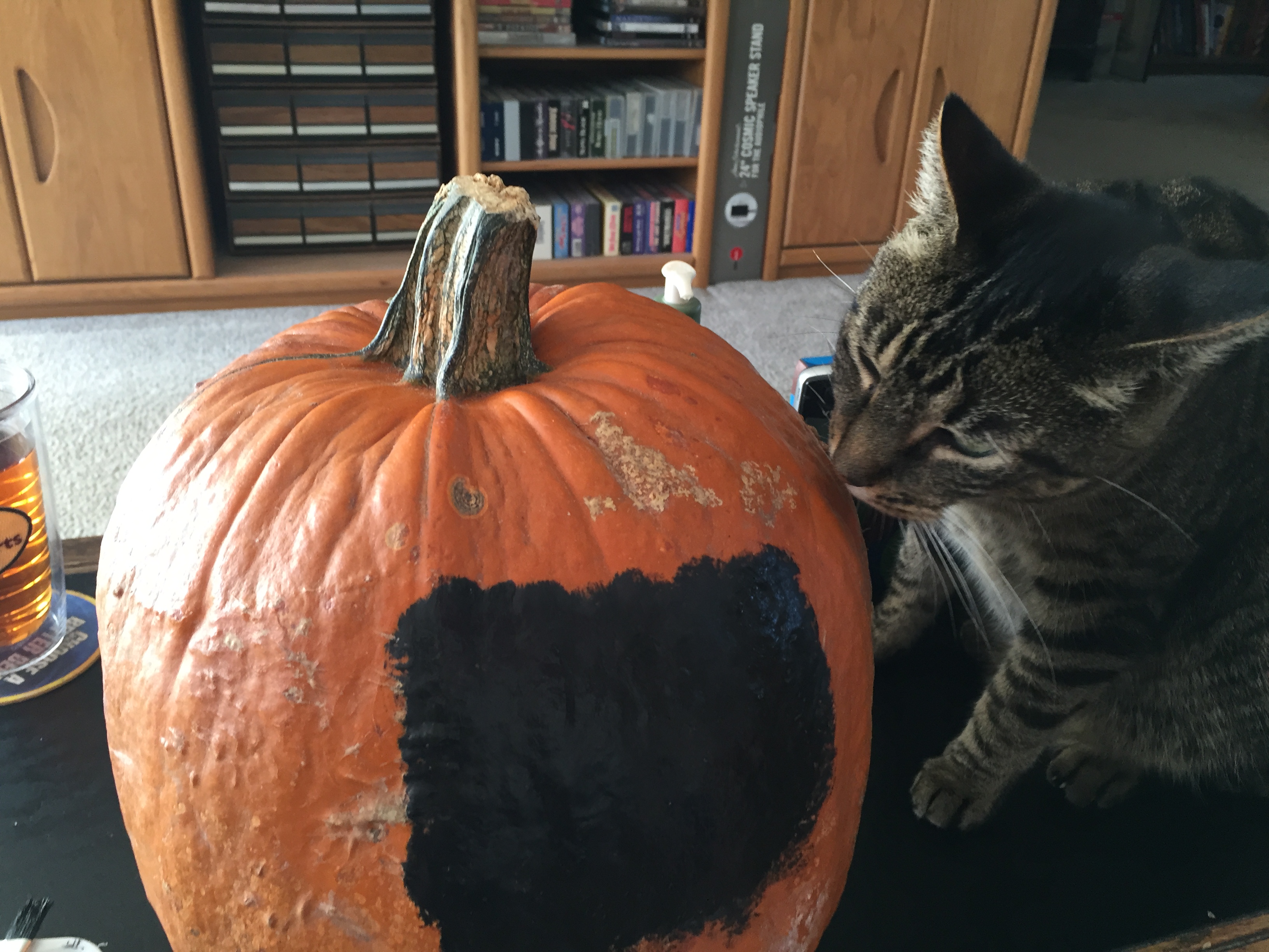 Bernie and I spend the day getting our pumpkin ready for the painting of faces and seashells. by painting an area with black paint. This helps the surface when you do the details on a face or sand castle. seashell’s, sunsets, star fish; you name it – put it on the pumpkin!