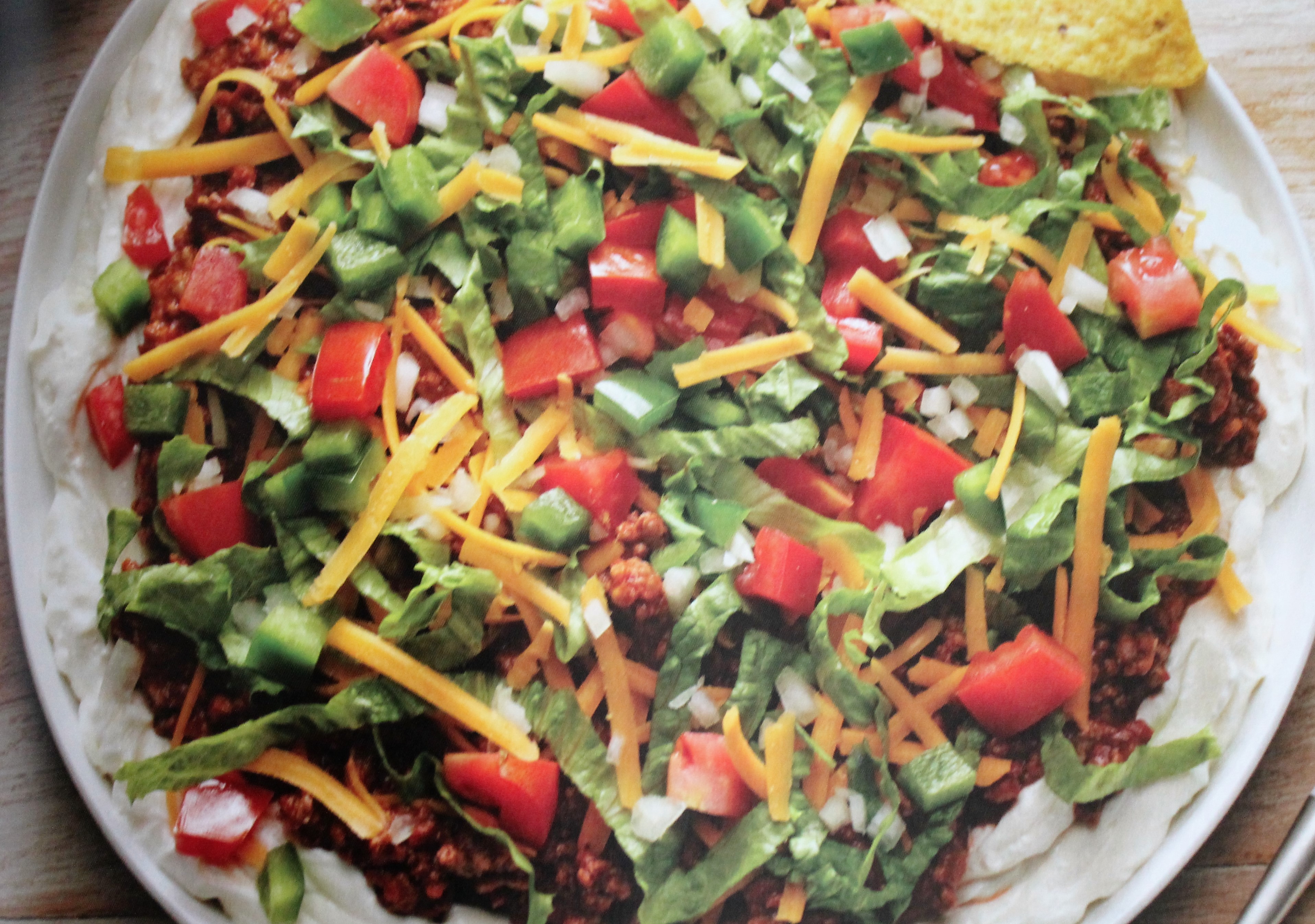 3. Just before serving, sprinkle with cheese, lettuce, tomatoes, onion and green pepper. Serve with chips. ENJOY!! Meatless Dip: For those who don’t like ground meat, you can use refried beans with a package of taco seasoning to add to the bottom layer. Can’t go wrong. Try it!!