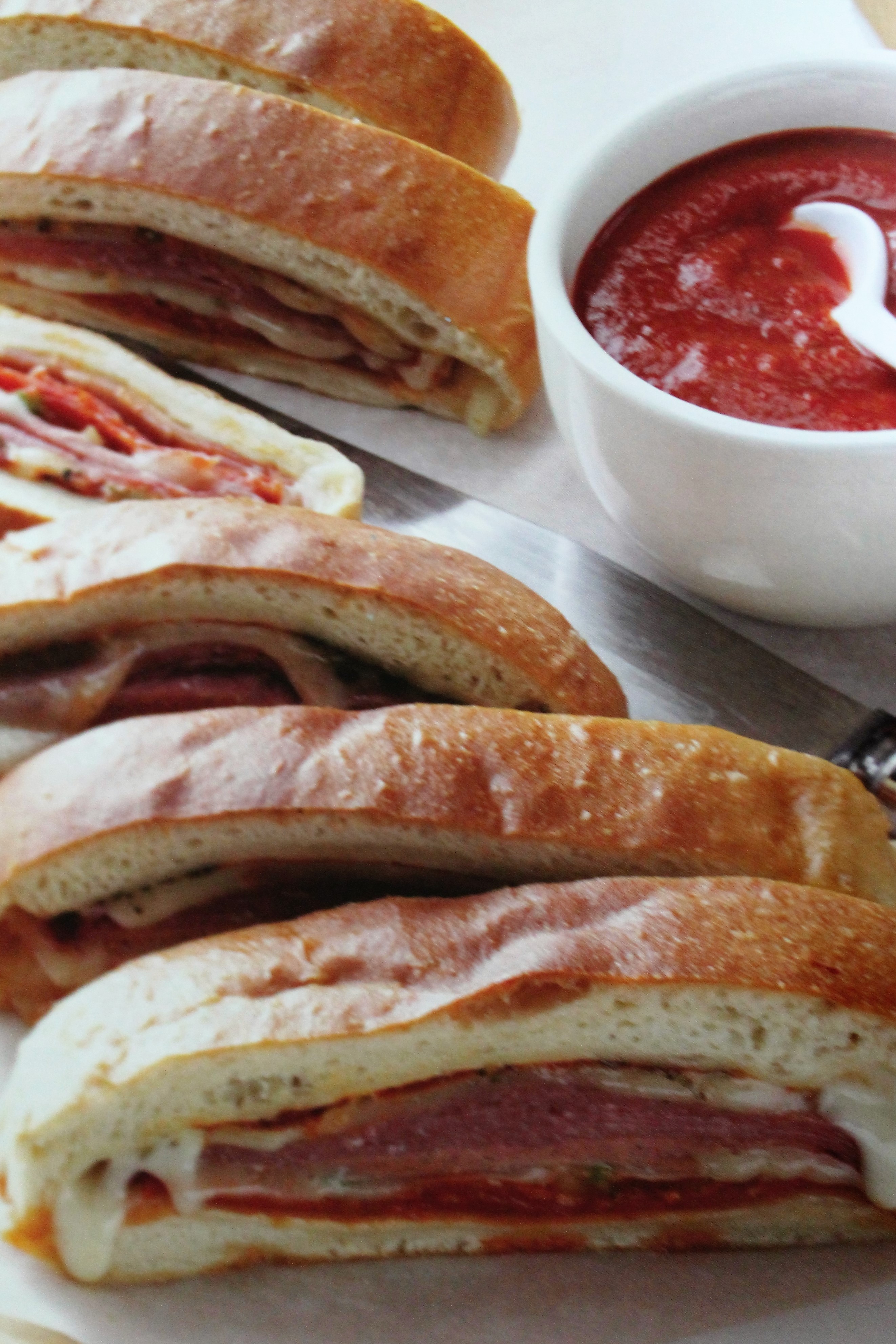3. Bake at 375 degrees for 30 to 35 minutes or until golden brown. Brush with melted butter. Heat the remaining pizza sauce and serve with sliced Stromboli. ENJOY!!