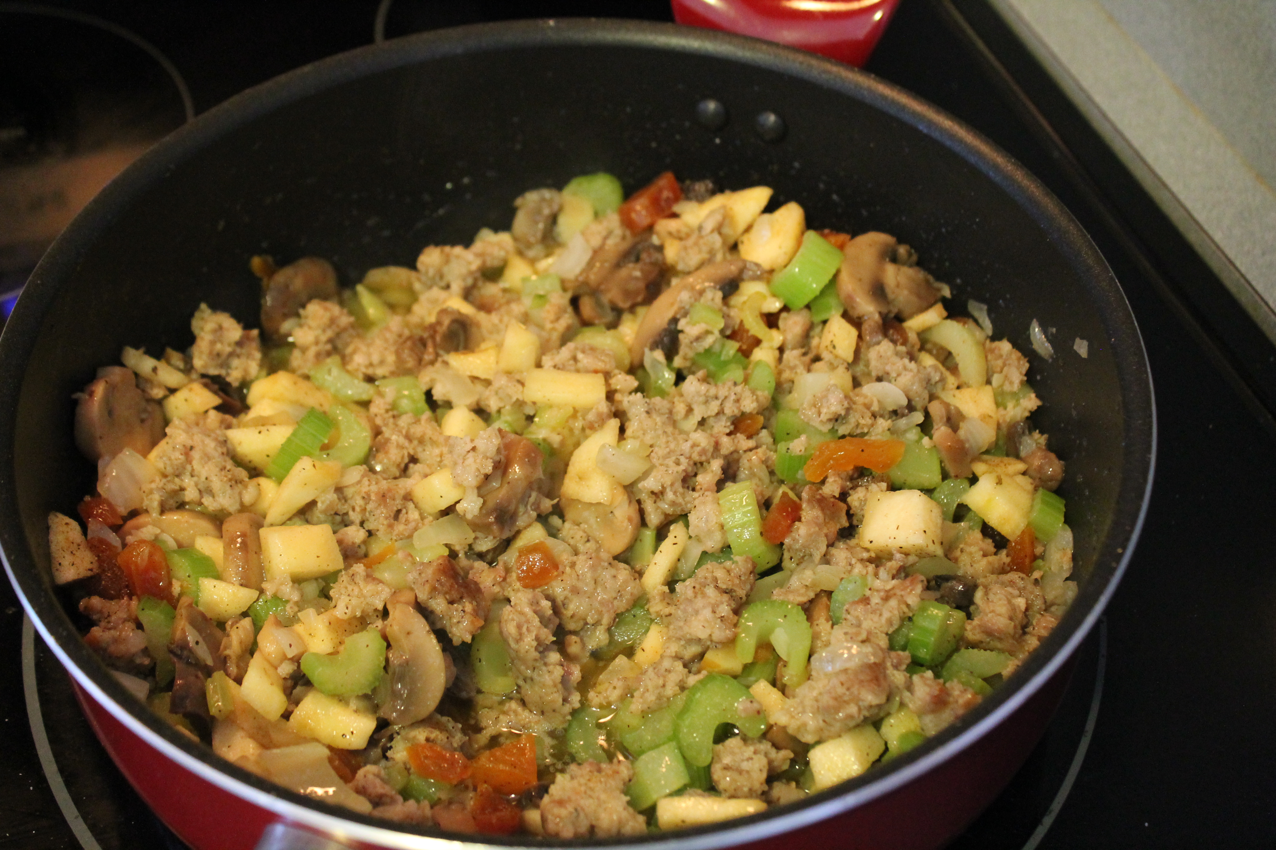 1. In a large sauce pan cook the sausage. When it is almost done I add the onions, celery, mushroom, and seasoning.