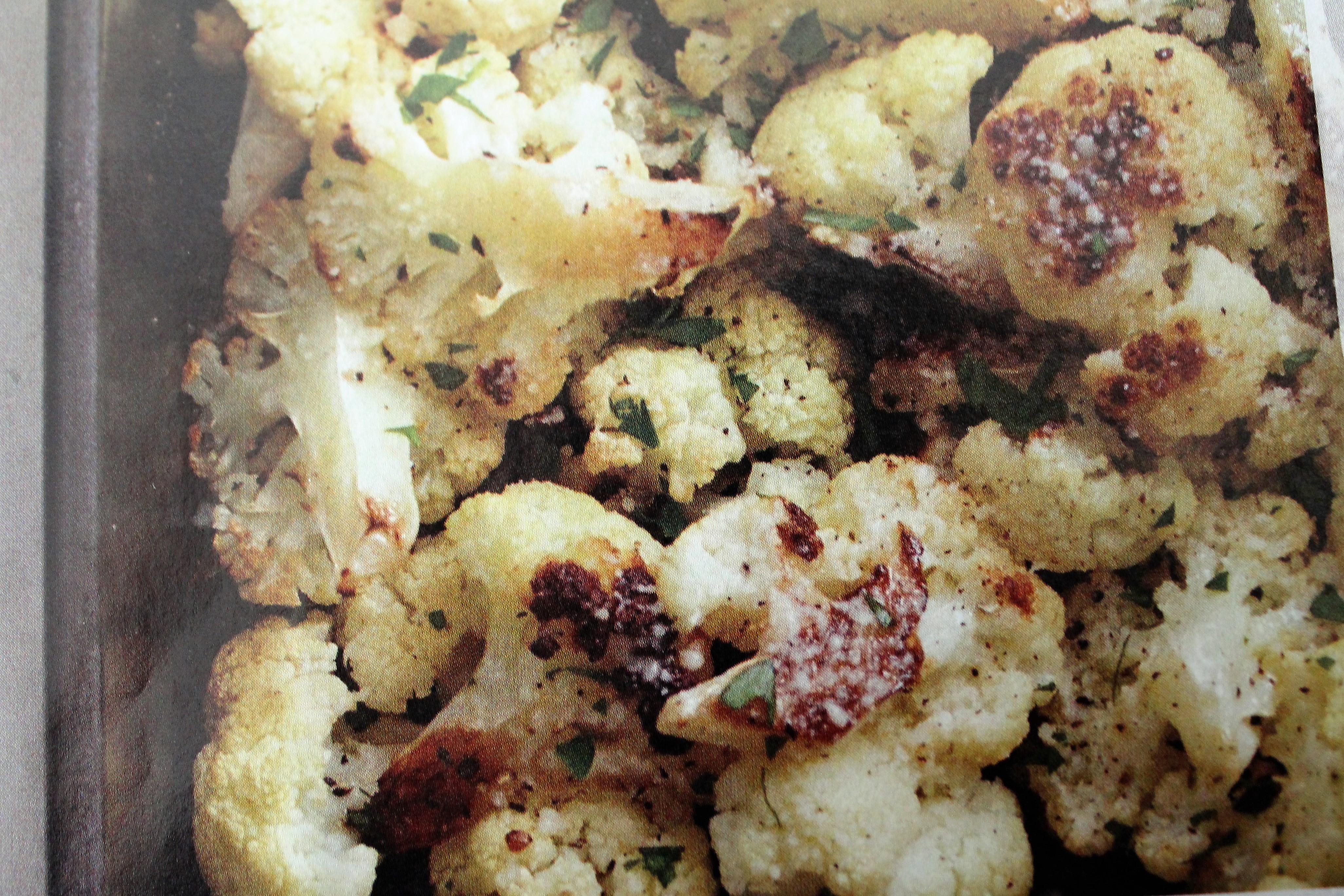 Slice 1 head of cauliflower into florets and halve; spread in a single layer on a baking sheet. Drizzle with 3 Tbsps. olive oil. Sprinkle with 1/4 cup grated parmesan, 1 1/2 tsp. chopped mixed thyme and rosemary, tsp. salt and few grinds of pepper. Roast at 425 degrees, 30 minutes; flip and roast 15 more minutes. Enjoy!!