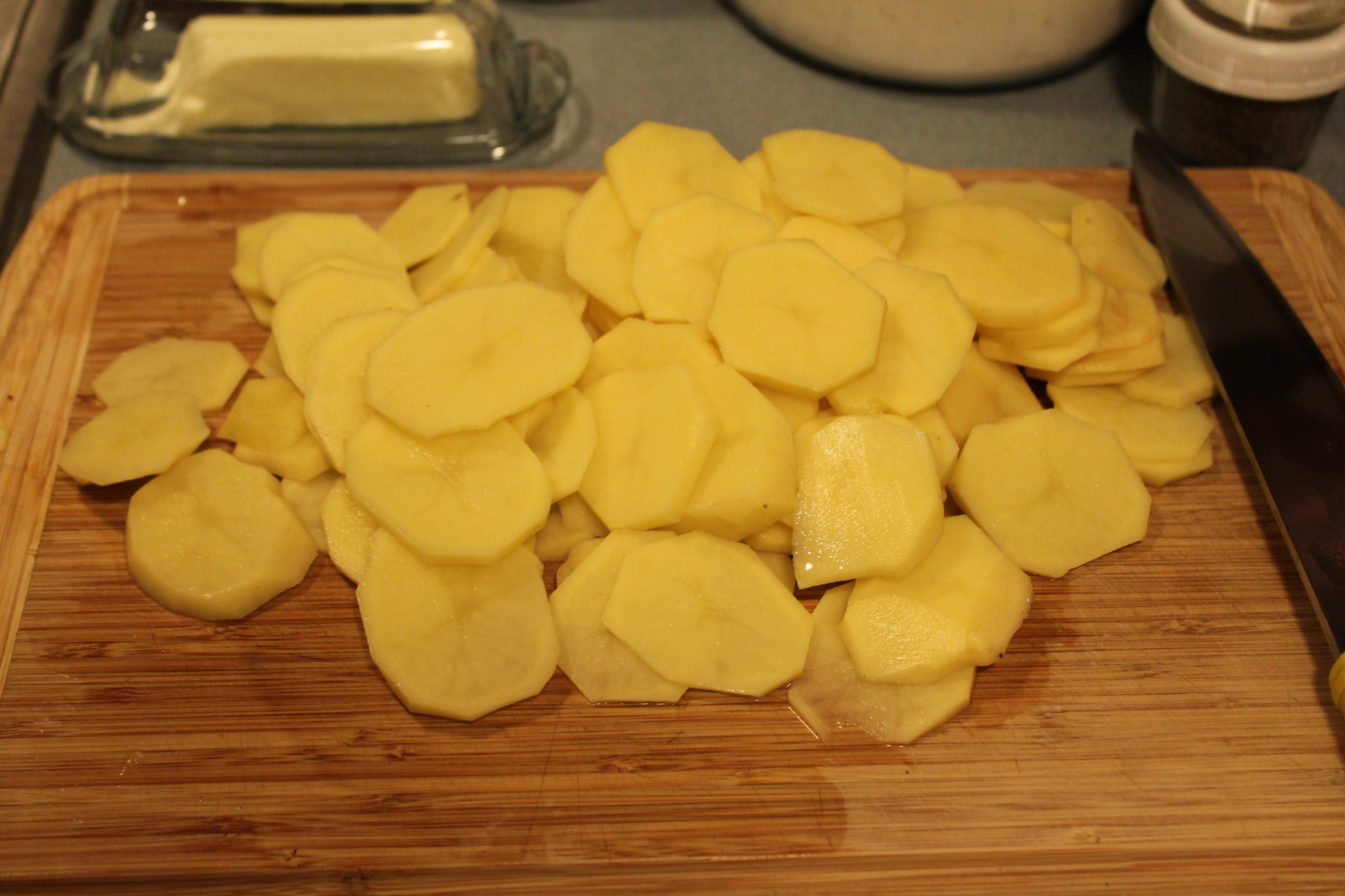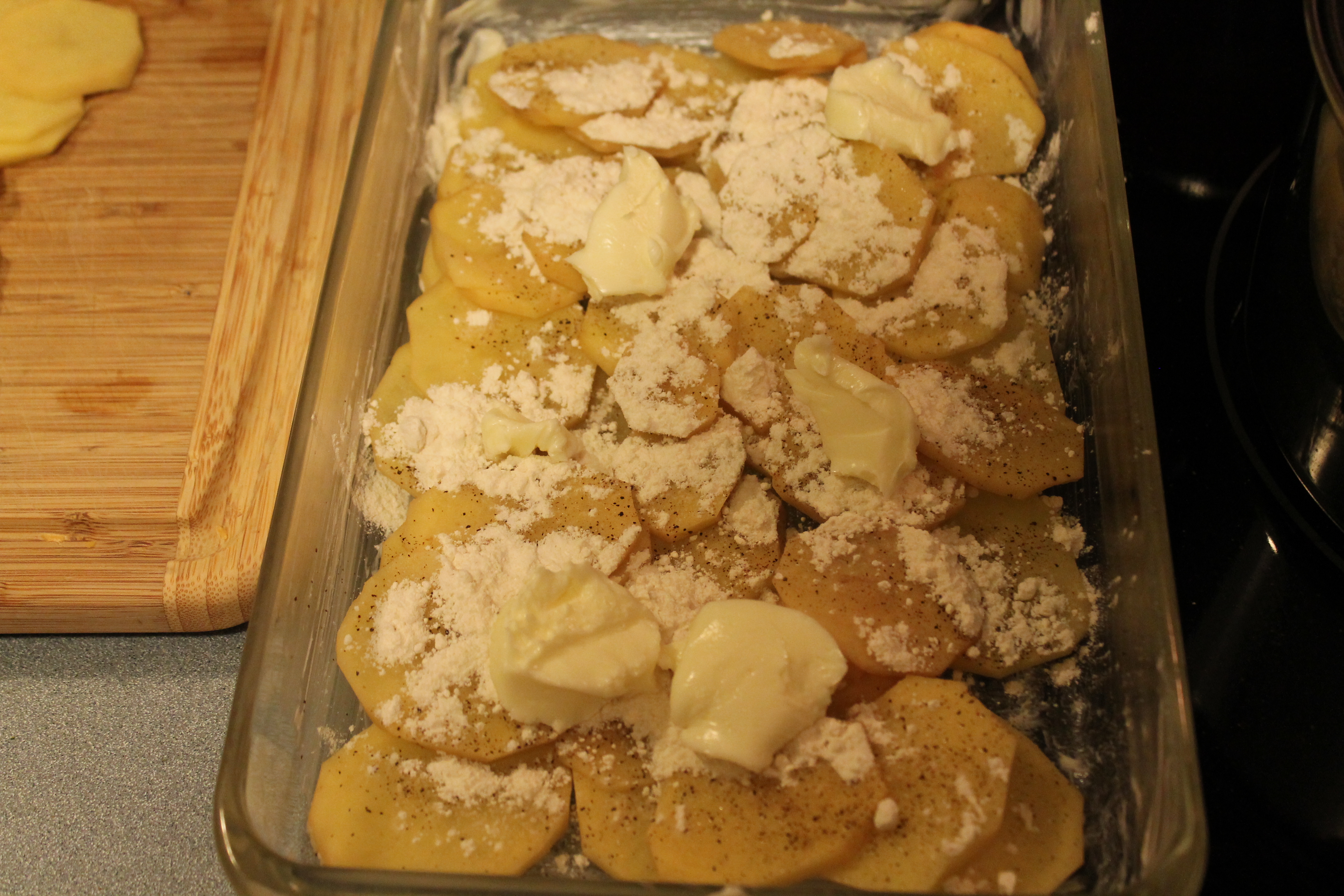 3. Arrange 1/3 of potatoes in bottom of baking dish. Sprinkle potatoes with salt and pepper and 3 tablespoons of flour, then dot with 2 tablespoons butter. Repeat layering 2 more times, until all potatoes.