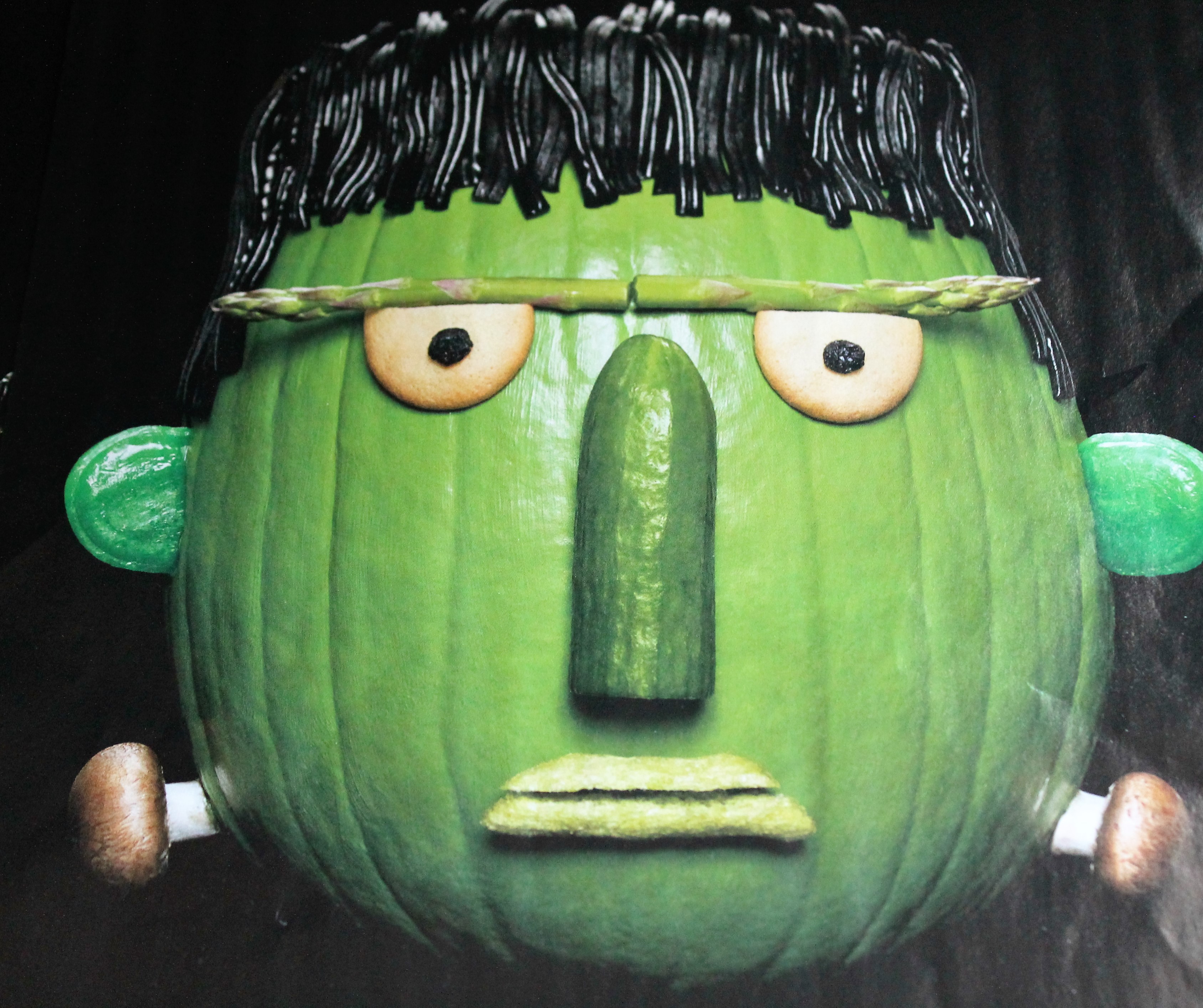 Paint the pumpkin green with acrylic paint; let dry. Unroll licorice wheels and snip into 3-inch pieces; affix to pumpkin with hot glue. For his eyes, cut a sugar cookie in half and use hot glue to stick a raisin on each piece. Affix to the pumpkin with hot glue. Brows are tops off asparagus stalks; affix to the pumpkin with hot glue. Nose is a cucumber half lengthwise, using toothpicks to attach. Lips pea crisp in half and ears are green lollipop. neck bolts are button mushroom.