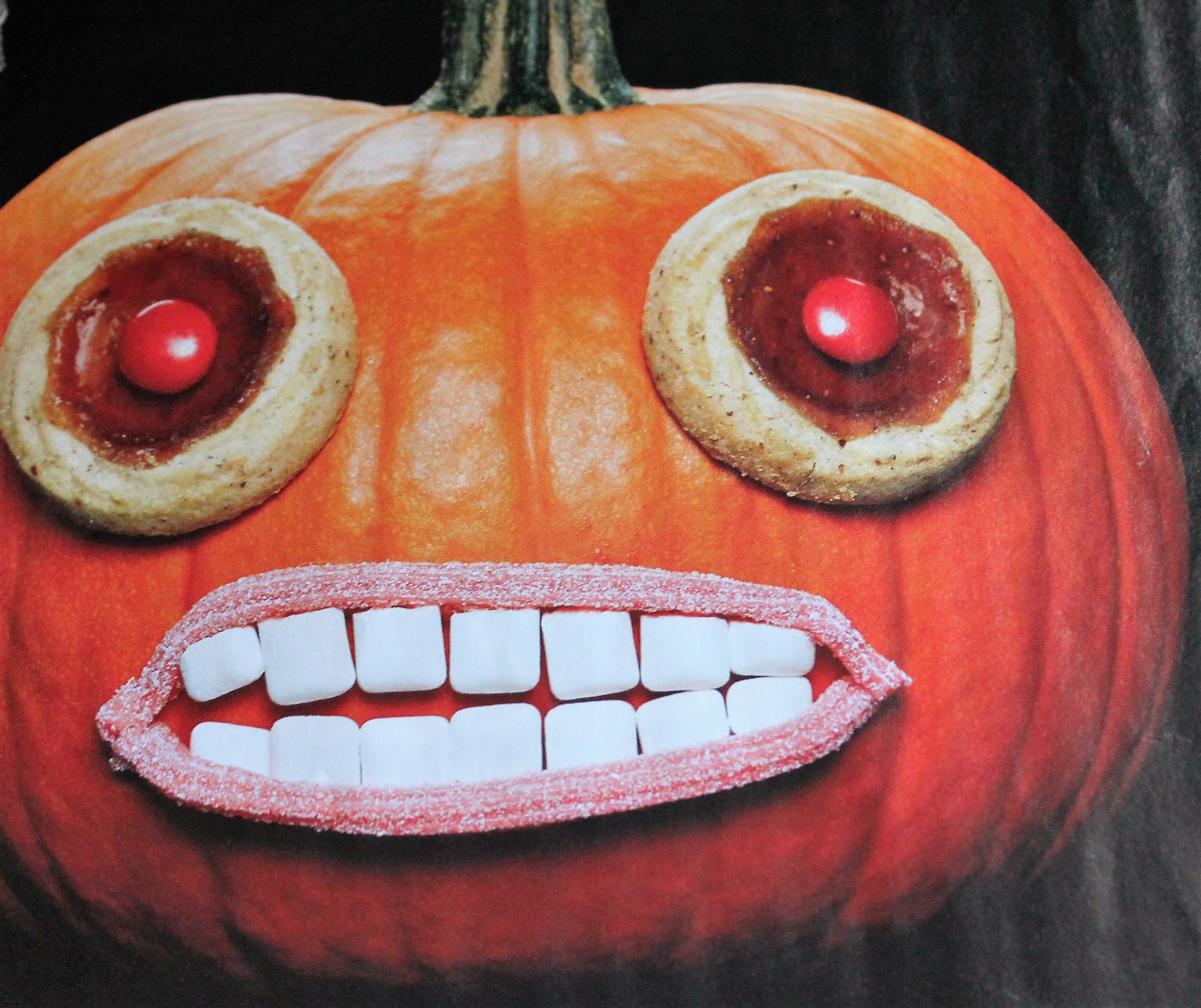 Attach a mint to a red licorice wheel with hot glue, then attach to the pumpkin. Or attach a red candy-coated chocolate to a thumbprint cookies with hot glue to the pumpkin for the eyes. Carve a hole and, using straight pins, outline the mouth with red sour straws(or just make the outline). For the teeth you can use pin chiclets along the edge of the sour straws.