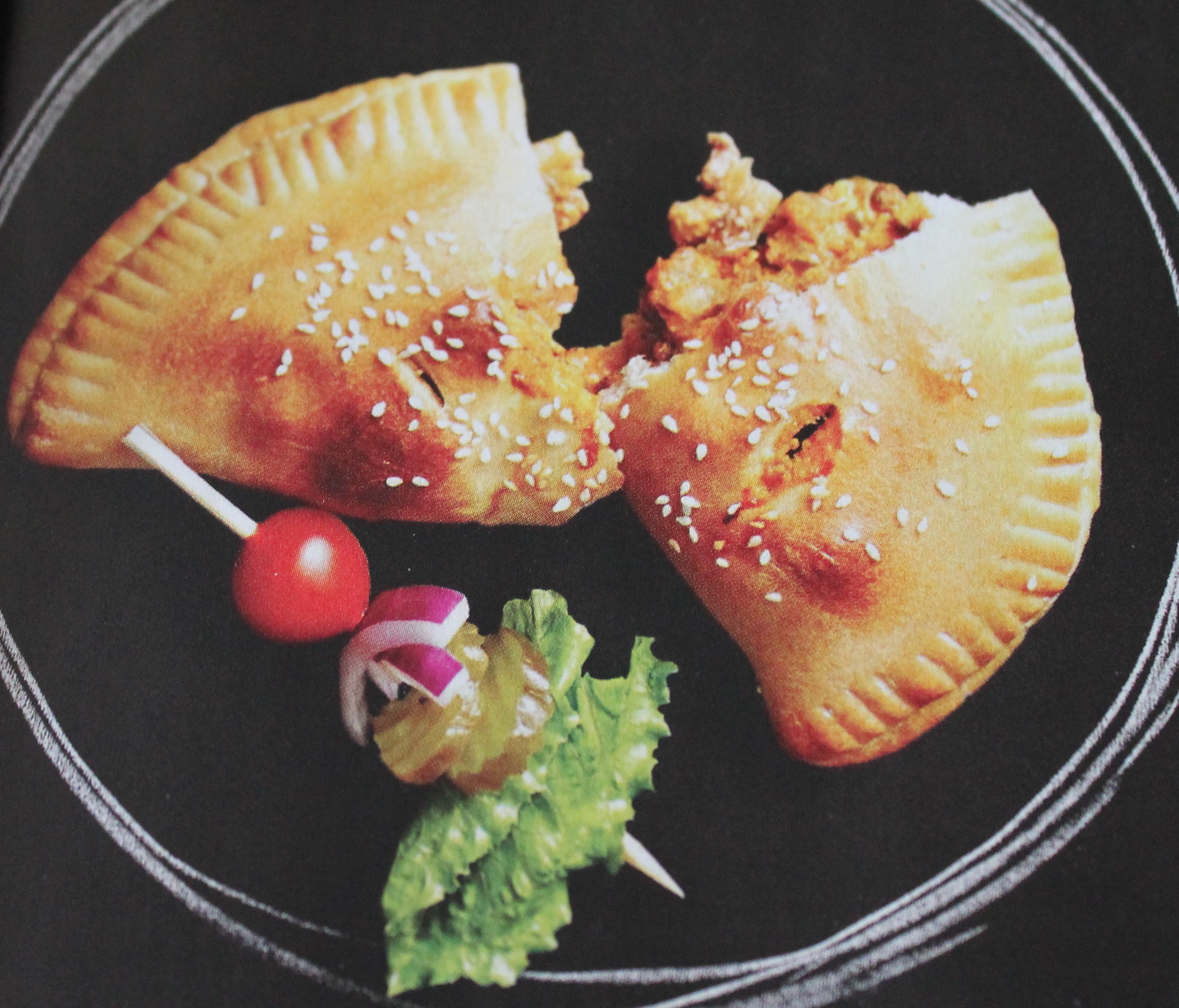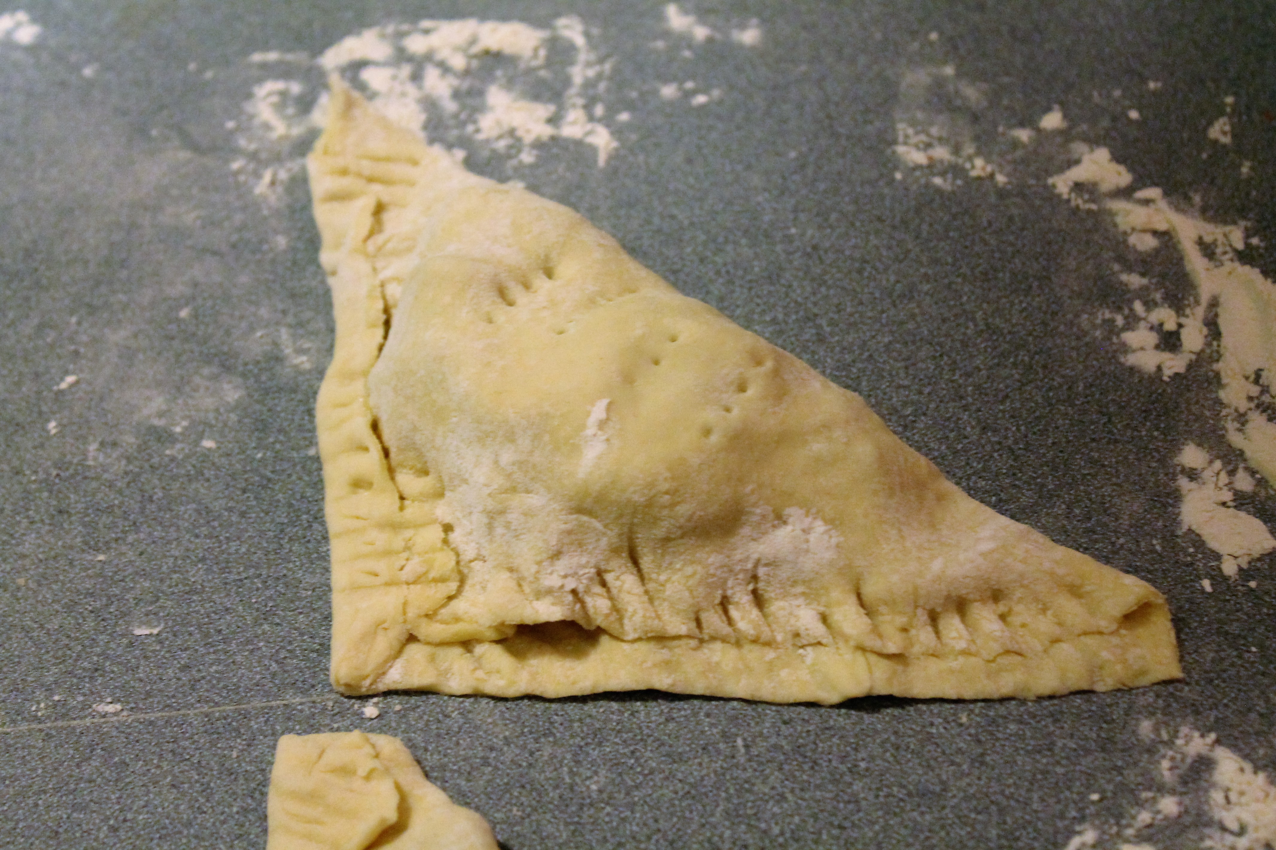 Spoon the chicken mixture in the center and fold the square in half to create triangles. One thing I would do different is place the flour pasty on the baking pan before spooning in the chicken mix. It’s a lot easy to handle.
