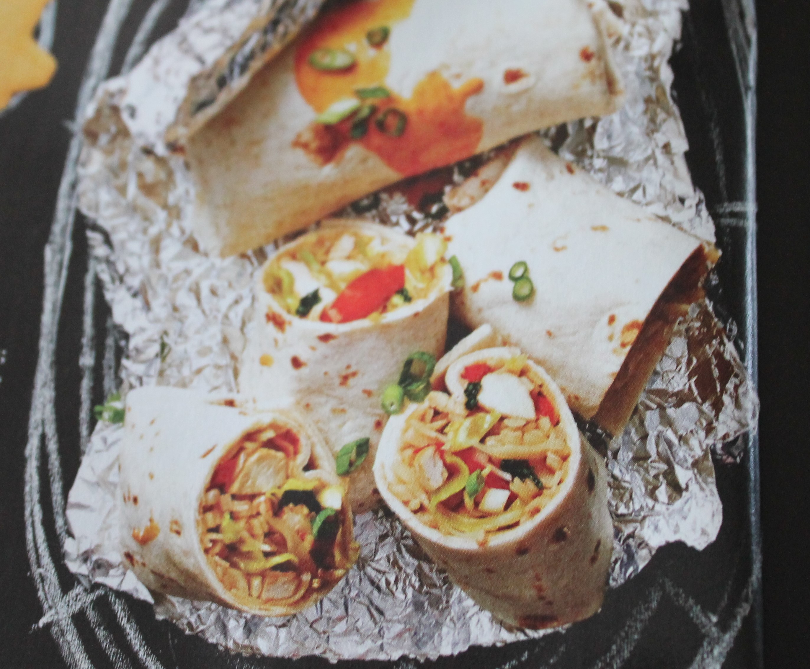 3. Spoon 1/3 cup of the noodle mixture onto each tortilla. Sprinkle with peanuts. Fold bottom edge of each tortilla over filling. Fold in opposite sides; roll up tortilla. Wrap each burrito in foil; freezer up to 4 months.