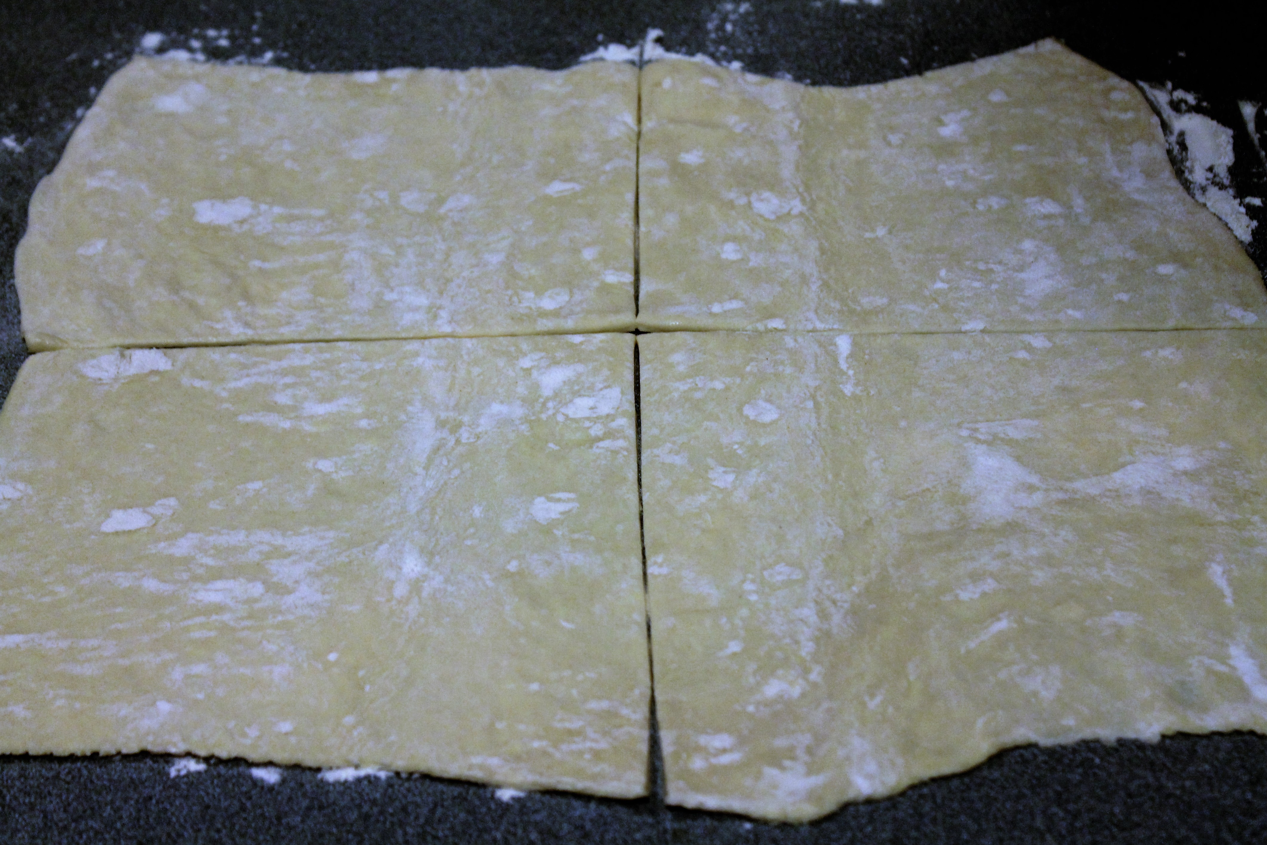 2. On a floured surface, unfold the puff pasty and cut into 4 squares. Gently roll out each square, increasing the size of the square by 20%.