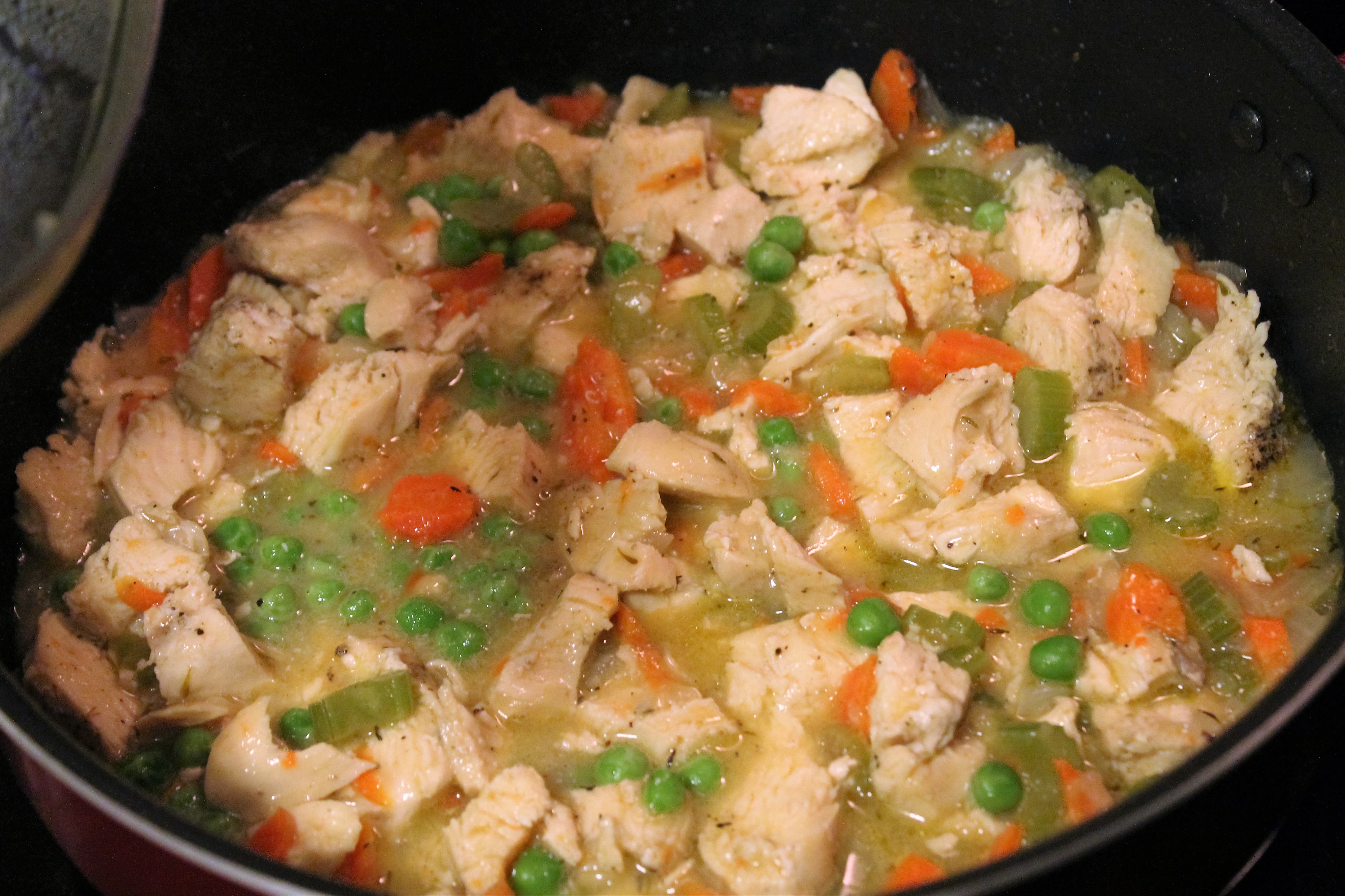 Add the garlic and thyme and cook for an additional minute, stirring frequently. Add the flour the flour and cook for about one more minute. Turn up the heat to medium, add the stock or wine, whisk altogether. Add the Dijon mustard, peas and chicken and cook at low heat until it thickens up into gravy, 5 to 10 minutes. Remove from heat and set aside.
