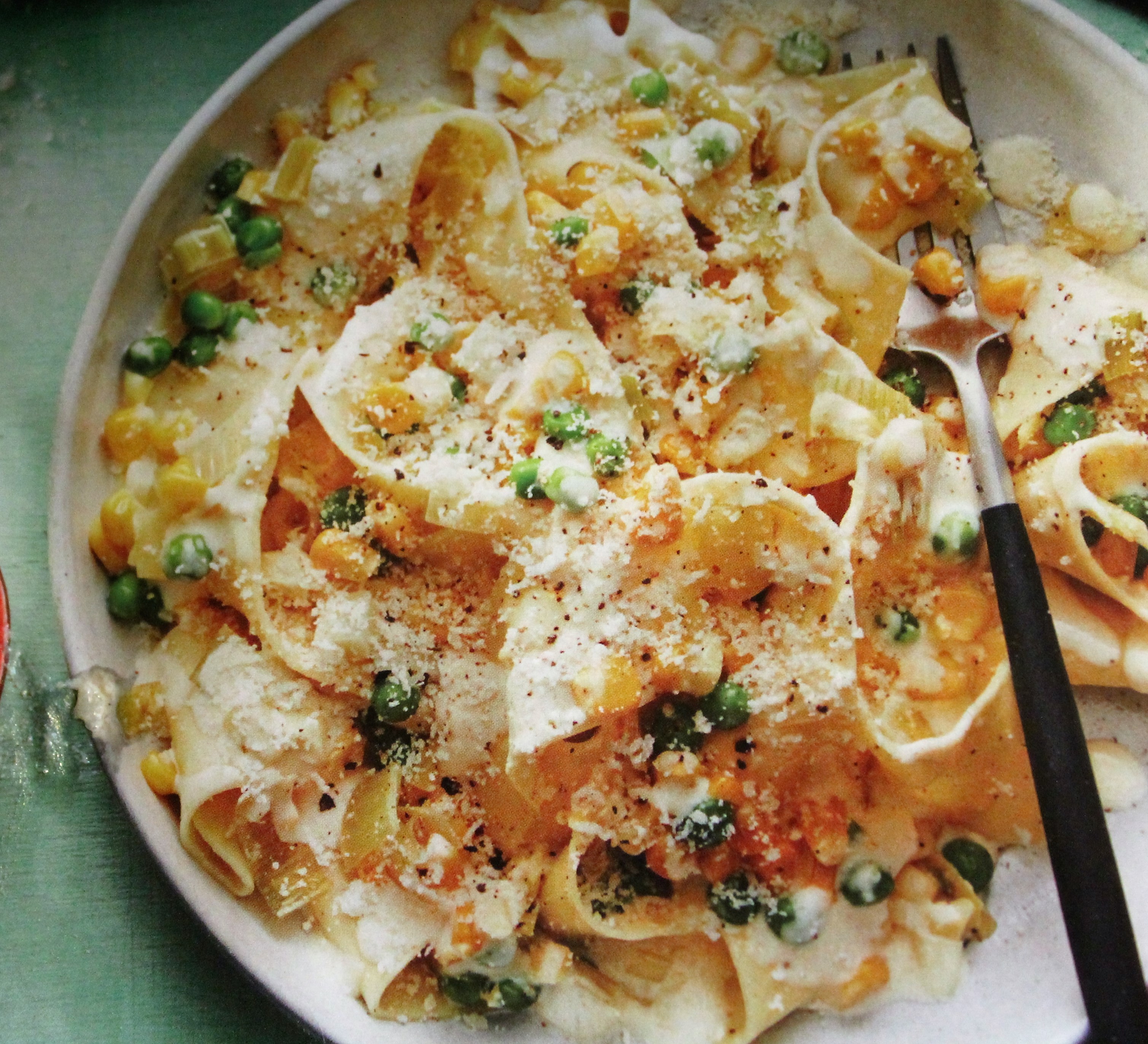 1. Bring a large pot water to a boil for the pasta. In a large skillet, heat the oil, one turn of the pan, over medium high. Melt the butter into oil, the add the corn, leaks and garlic; season with salt and pepper. Cook, stirring often, until the leeks soften, about 5 minutes.