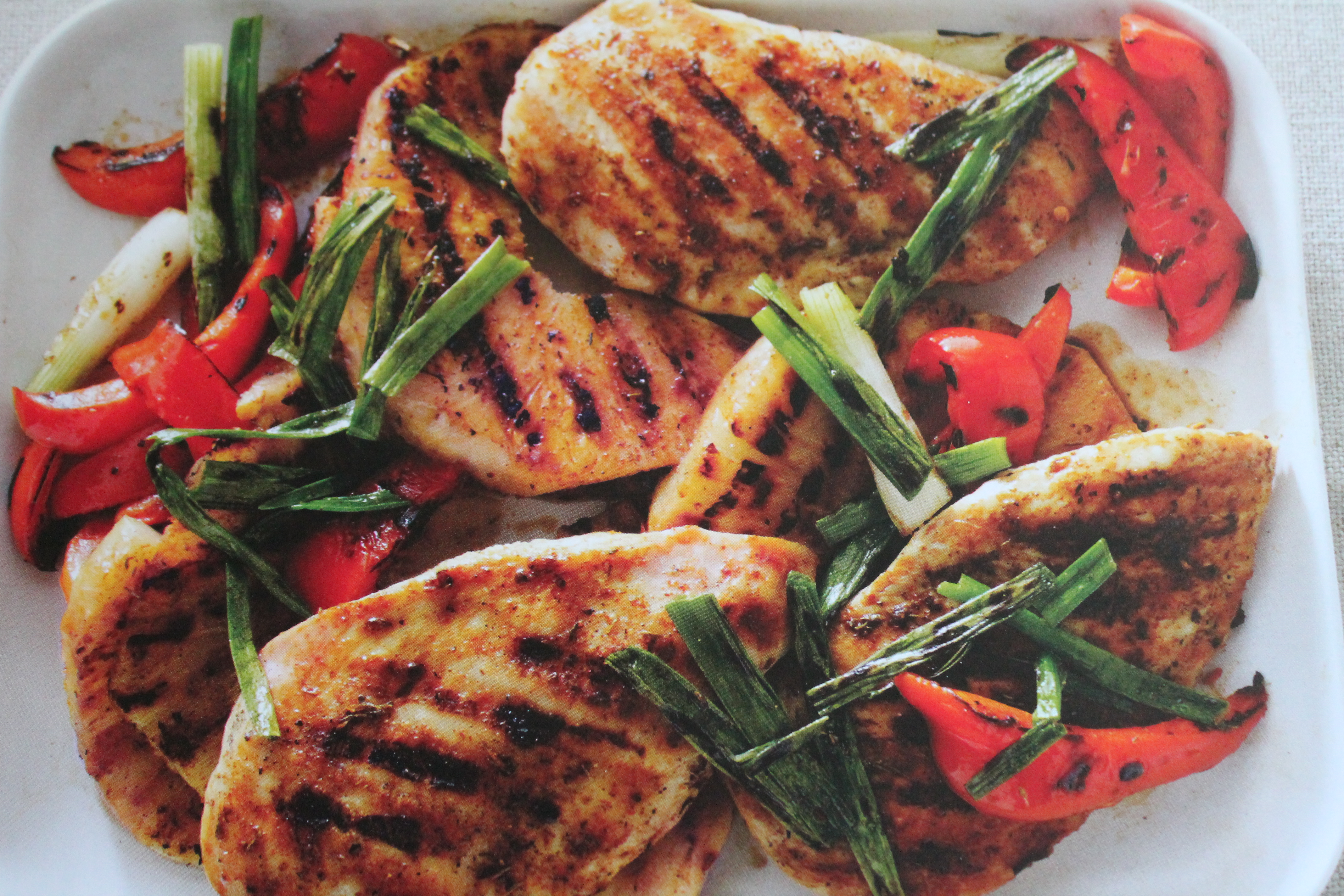3. Arrange the chicken on the grill; cook until marked, 7 to 9 minutes. Flip the chicken and add scallions, bell peppers and pineapple to the grill. Also add the squash. Cook until the vegetables and pineapple are marked and tender and the chicken is cooked through, 7 to 9 more minutes. ENJOY!!